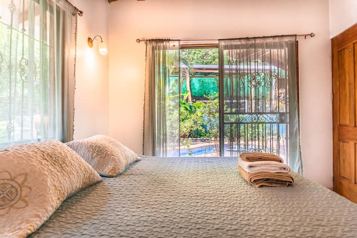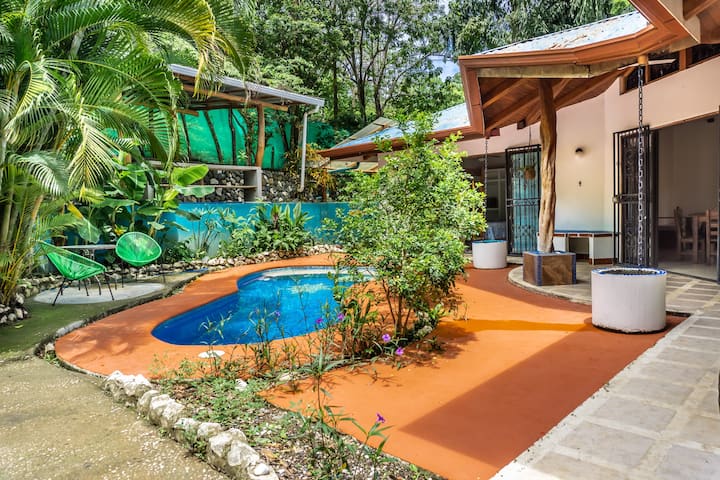 A peaceful oasis nestled amidst beautiful palms and local fruit trees. It is a 20-minute walk, or 2-minute car ride to the centre of Samara and a 15-minute walk to Samara beach. The house is also a short walk to Buena Vista beach and the secluded, “Secret Beach”. This beautiful 3 bdrm, 3 bthrm home features a stunning pool and patio, large indoor living space with a modern kitchen.